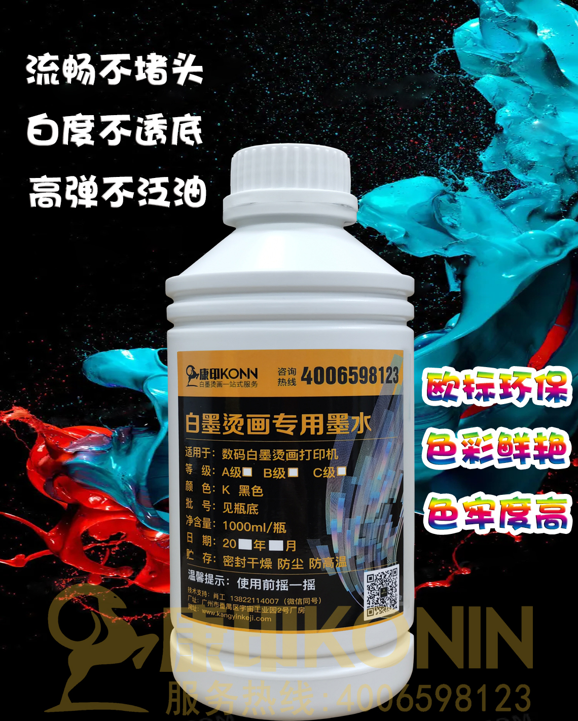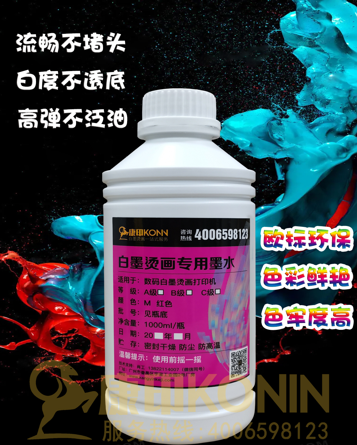 白墨燙畫(huà)墨水特點(diǎn): 彩色墨水:歐標(biāo)環(huán)保 色彩鮮艷 色牢度高 白色墨水:流暢不堵頭 白度不透底 高彈不泛油